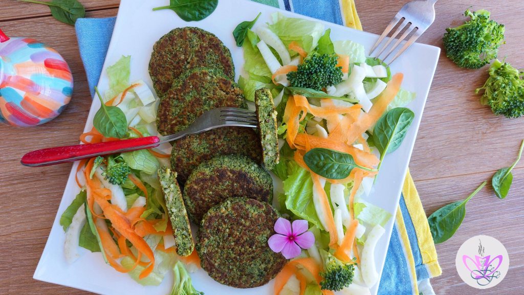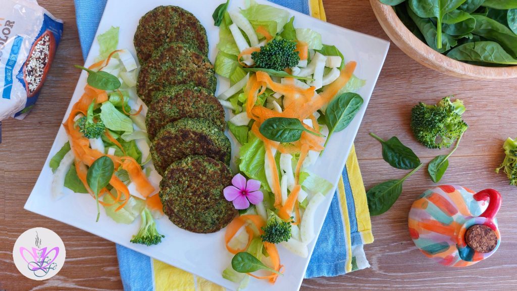 A few weeks ago, while I was grocery shopping, I confess that I was tempted to buy some ready-made veggie burgers, the kind that take just a few minutes in the pan or air fryer to serve! Sometimes there are days when it’s hard to organize in the kitchen, and it’s convenient to have something quick to put on the plate! Of course, I succumbed to the allure of the ready product because the ingredient list was absolutely great, but the taste did not completely satisfy me! Quinoa, spinach, and cabbage were the main ingredients, yet they seemed rather bland! So, I decided that I could easily replicate them at home with better results, replacing the cabbage with broccoli florets or, if you prefer, other vegetables you have in the fridge! Well, what can I say? The taste of “homemade” is incomparable, and I am also against food waste! Moreover, they are prepared quite quickly because the broccoli is stewed for a few minutes in a pot with a leek and half an onion, and everything is put in a food processor! The quantities I leave you are perfect for a family of 6; otherwise, once cooked, you can freeze them and defrost them as needed! Quinoa, by the way, is a gluten-free pseudo-cereal, so just replace the regular breadcrumbs in the recipe with gluten-free ones to make them suitable for celiacs! For the rest, they are veggie burgers, so they are suitable for the whole family and also for those following a vegan diet. Rich in vitamins, minerals, and anti-inflammatory and antioxidant properties thanks to spinach and broccoli, they are perfect and practical to prepare and bring to the office, on a day trip, or as a dinner saver!