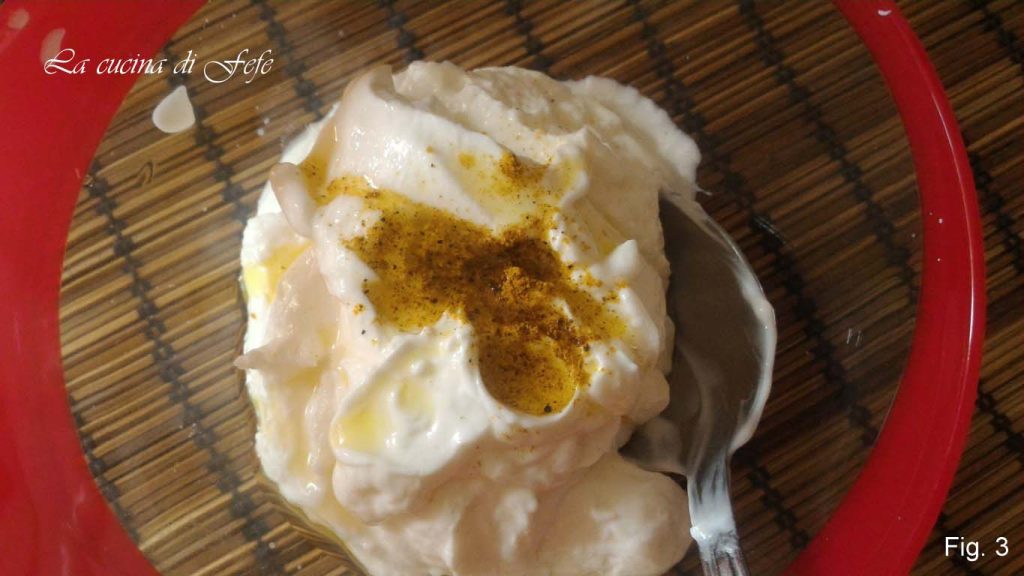 Pour the yogurt into a bowl, drizzle with olive oil, add the spices, a pinch of salt, and a dash of pepper (fig. 3).