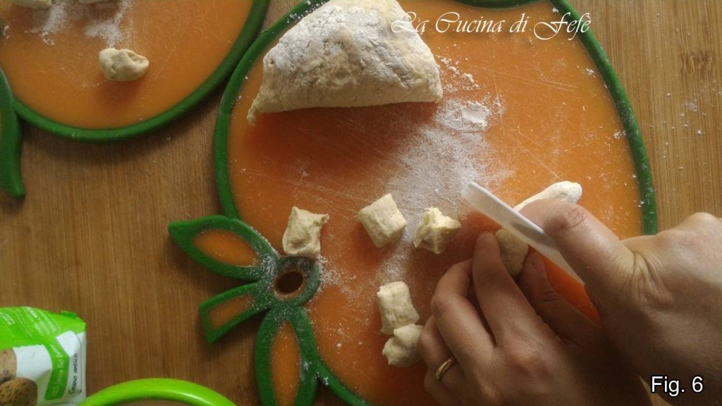 Cut it into pieces with the help of a scraper and place them on a lightly floured cutting board or towel (fig. 6). Always with a little flour, gently press them with the tines of a fork or roll them on a gnocchi board (fig. 7).