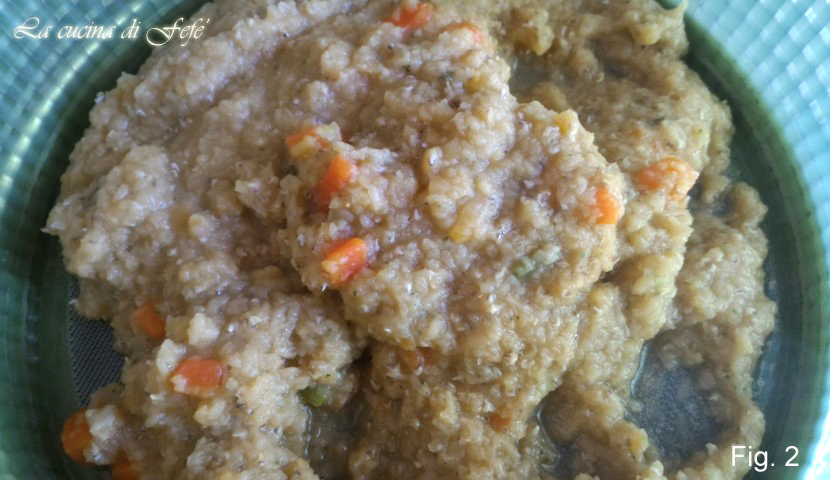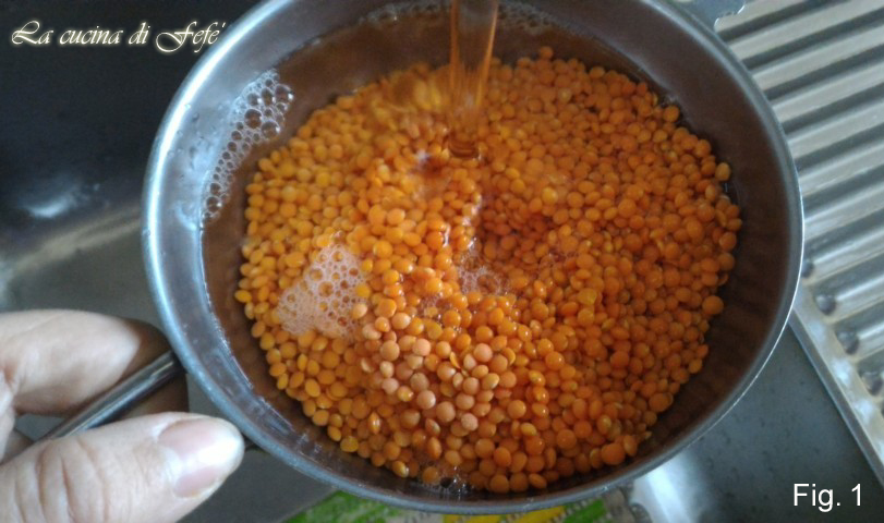 • In a large pot, sauté the chopped onion in a drizzle of oil. Add the red lentils and toast them for 1/2′. Cover with hot vegetable broth until the lentils are covered. Bring to a boil and continue cooking over low heat for 15′, or according to the cooking times on your package. Once cooked, the lentils should fall apart. Turn off the heat, adjust the salt and pepper, and let them drain from their water (fig. 2