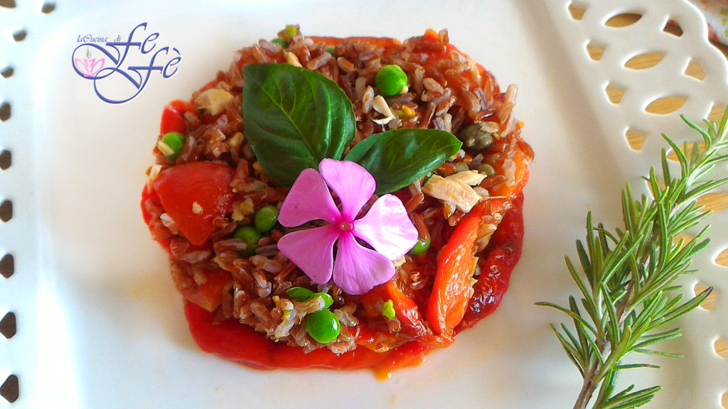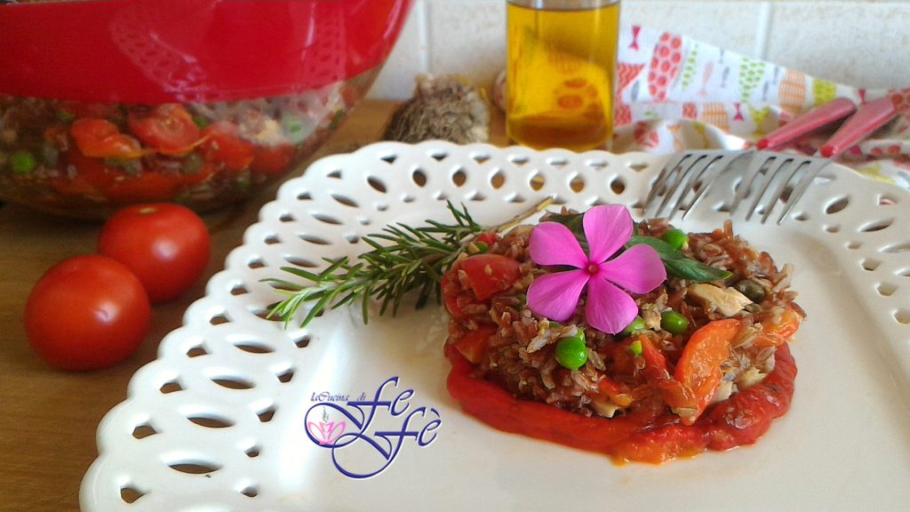 September reminds us that we are nearing the end of summer, yet it’s still warm enough to crave fresh and light dishes that can be prepared quickly! The recipe I offer you is based on red whole grain rice, a type of rice with an elongated grain and natural color that remains robust and crunchy. Rich in selenium and magnesium, I find this cereal very tasty and suitable for being served cold as a salad, making it perfect for these still incredibly summery days!!! A highly fragrant first course thanks to the seasoning made by marinating the oven-baked peppers cut into strips for a few hours, and adding tuna to make this dish not only more flavorful but also nutritionally complete. After all, everyone adds their own flair to everything they do, in terms of personal taste and creativity. Furthermore, it is lactose-free and gluten-free, making it suitable for those who cannot consume gluten. Easy, delicious, and healthy, what more could you want?