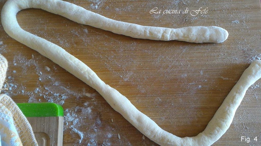 On a lightly floured surface, take parts of the dough and form sticks about 3/4 inches in diameter (fig. 4).