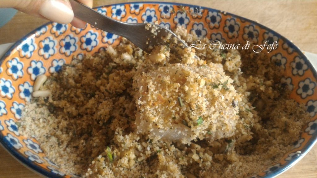 • Take the fillets, place them on the cutting board with the skin facing up, drizzle some oil and place a teaspoon of Swiss chard and a teaspoon of flavored breadcrumbs on each.