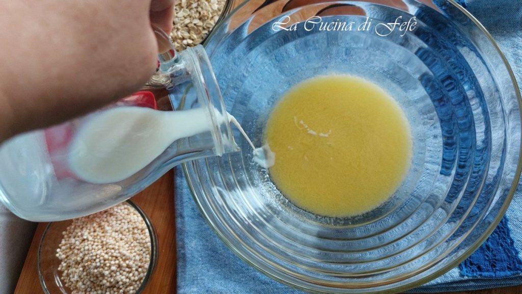 • Start mixing with a fork to combine the two liquids and also add the oat milk or another vegetable drink of your choice, or regular cow milk if you prefer.