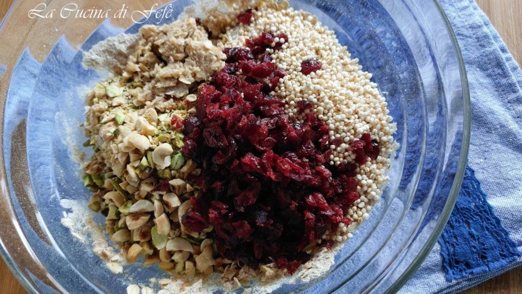 🟣If you don’t like or don’t have dried cranberries, you can also omit them or replace them with raisins, which can provide natural sweetness allowing you to reduce added sugar even further; or with chopped dried apricots, noting that they will give a slightly sweeter and less tangy flavor than cranberries. Finally, chopped dried figs are excellent for highlighting the rustic nature of whole grain flour and the Mediterranean tradition in combination with pistachios.
