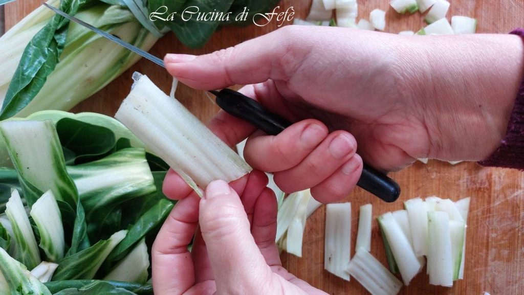 • Cut the ribs into small cubes. The green leaves should be stacked, rolled, and sliced into strips about 1 1/4–1 1/2 in wide.