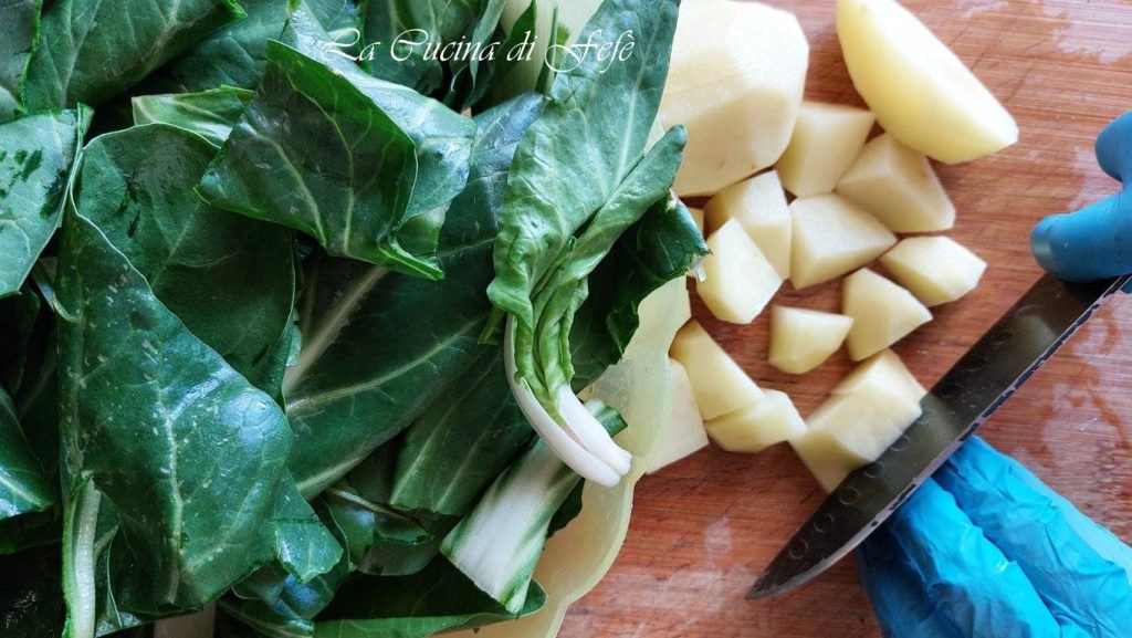 • Start by cleaning the Swiss chard: separate the leaves from the ribs (the white part). Immerse them in plenty of cold water (you can add a pinch of baking soda) and let them rest for a few minutes. Rinse them several times until the water is perfectly clear.