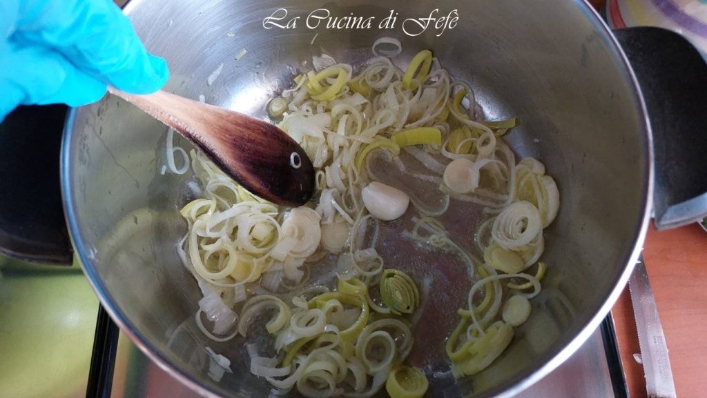• In a large pot (better if heavy-bottomed), heat a generous splash of extra virgin olive oil. Add the leek (or spring onion) and the whole garlic clove (either unpeeled or peeled). Let it soften over low heat until the leek is tender and translucent, stirring continuously so it doesn’t burn.