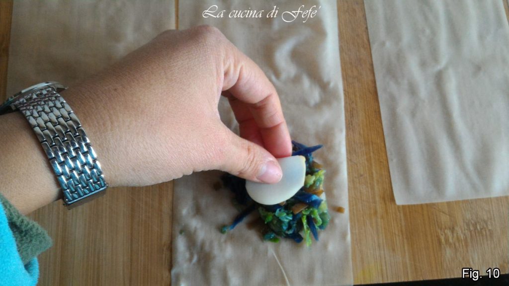 Roll out one sheet of phyllo pastry at a time and cut it, obtaining four rectangles approximately 13.7×4.3 inches (fig. 7).