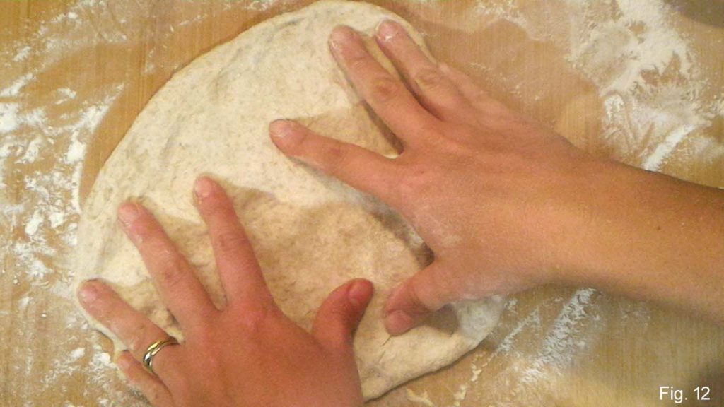 The next morning, let the dough acclimate to room temperature for at least 1 hour. Then let the unrisen dough slide onto the floured work surface without forcing with your hands, but at most with the help of a dough scraper. Proceed with the portioning, dividing it into two portions of about 8.8/9.9 oz each.