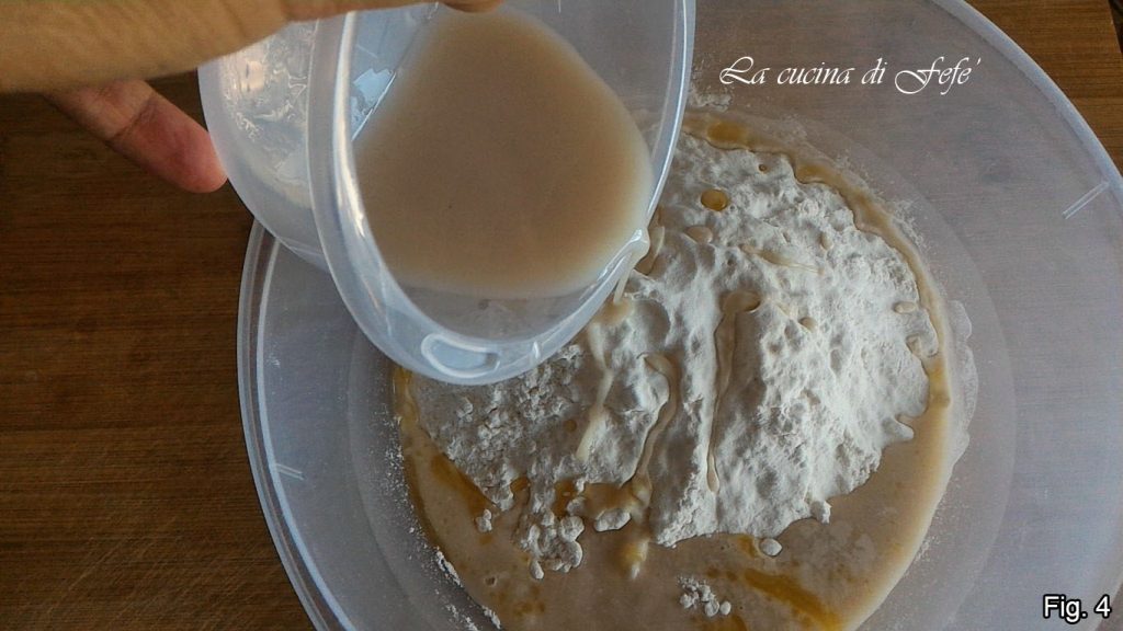 In a large bowl, pour the sifted flours, then add the oil and the dissolved yeast (fig. 4).