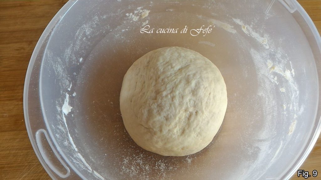 Knead for a long time until you get a smooth and elastic dough, transfer it to a bowl, and cover with plastic wrap (fig. 9).