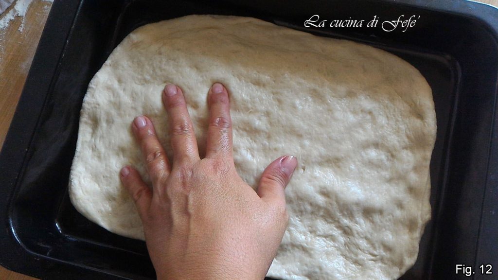 Spread the larger dough with your fingertips directly on a well-oiled baking pan, using slightly oiled hands to help (fig. 12).