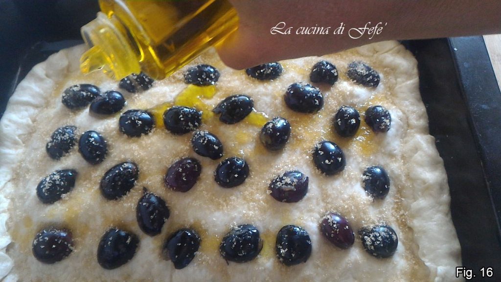 Distribute the grapes over the surface and sprinkle with the remaining sugar, then drizzle with another little oil or, if you like, two tablespoons of honey (fig. 16).