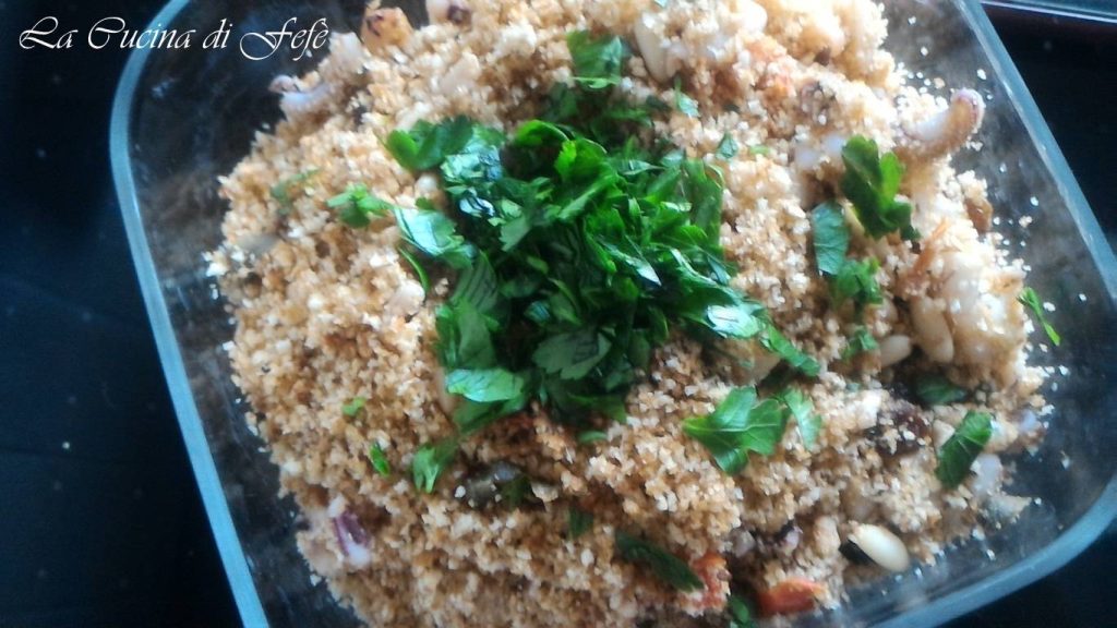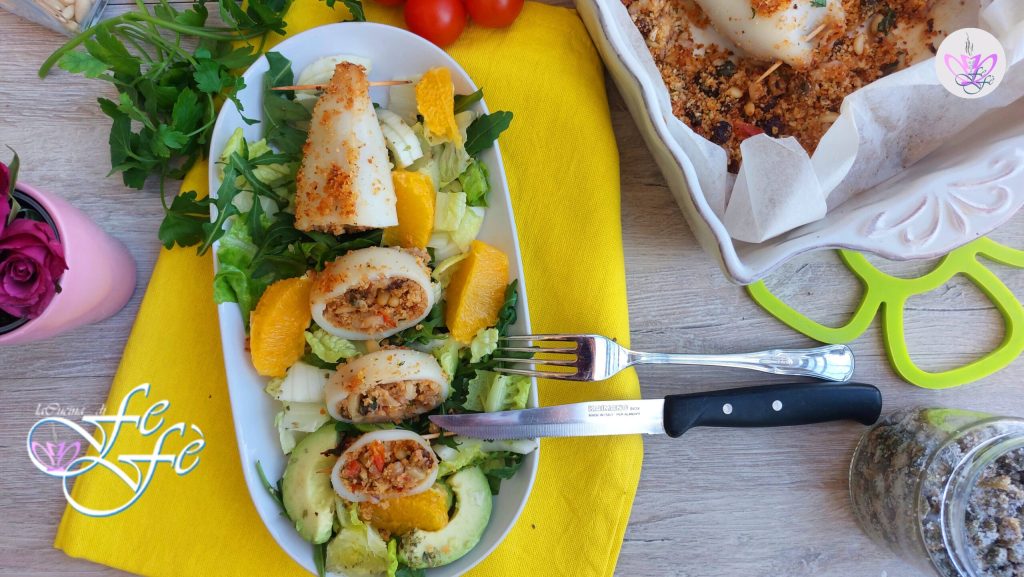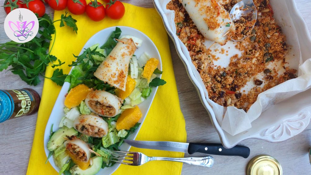 Have you ever heard the dialectal expression “ammutta a muddica“? A saying made in Sicily, behind which there is a world! Literally, it means push the crumb, usually used to encourage someone during difficult and crisis moments, but it finds its origins in Sicilian popular tradition, involving cooking and what Sicilians do best: ammuddicare everything and stuff, pushing, with breadcrumbs! This tradition of Sicilian sayings is rich with phrases like this, drawing inspiration from daily life and especially good food, but sooner or later I will talk more about this! But let’s get back to us and today’s recipe, which indeed recalls the aforementioned dialectal expression. It’s about stuffed calamari, but with what? Breadcrumbs, of course, and not only! The stuffing is indeed rich and special, made with typical Mediterranean ingredients like pine nuts, raisins, cherry tomatoes, and capers, just to name a few. There are different versions of Sicilian stuffed calamari that I hope to show you gradually, so you can choose the one that best suits your taste! The secret for the perfect recipe to avoid the stuffing from coming out is one for sure: don’t ammuttar too much a muddica, meaning don’t overfill them, because the risk is that the calamari sacs, which tend to shrink during cooking, might break! Otherwise, making them will be a breeze, and you can present them as part of your holiday menus because tasty and traditional dishes like this are very suitable! A must for us Sicilians with an unmistakable aroma and mouth-watering!