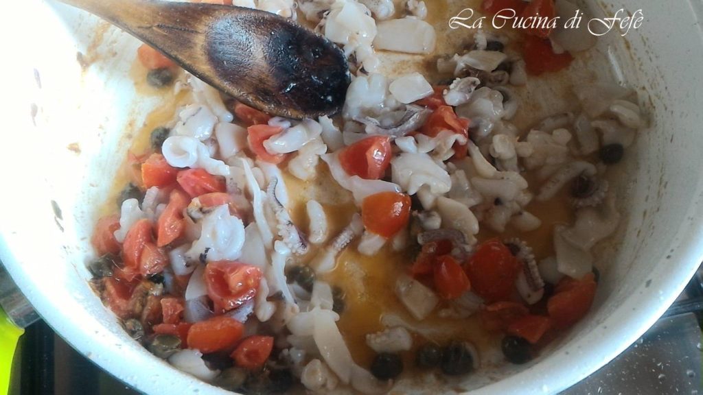 • Add the cherry tomatoes, chopped tentacles, and deglaze with white wine, raising the heat to evaporate the alcohol.