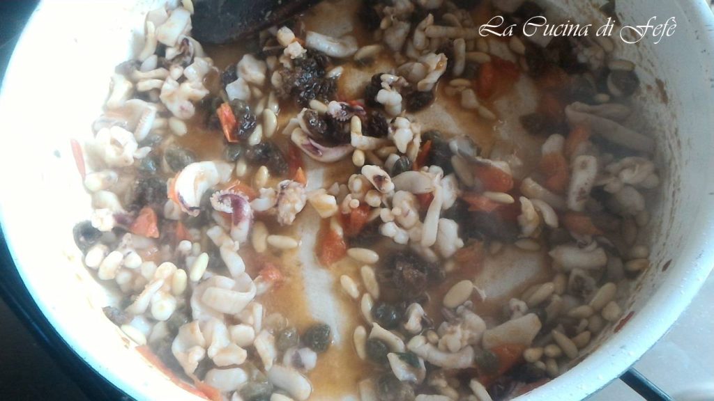 • Once the alcohol has evaporated, lower the heat and add the pine nuts and raisins, previously soaked in warm water and drained.
