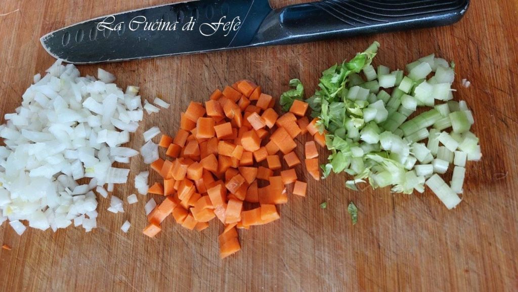 Start by cleaning the vegetables: wash them well, peel the onion, trim and peel the carrot, and remove the strings from the celery, then cut them all into small and regular cubes for the sauté.