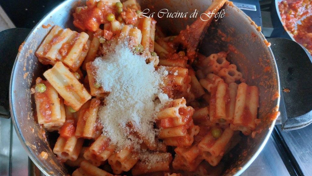 Return it to the pot and season it with a few ladles of sauce so that it can be well flavored without leaving dry parts, then add 1-2 tablespoons of grated Parmesan and Sicilian pecorino previously mixed, and stir.