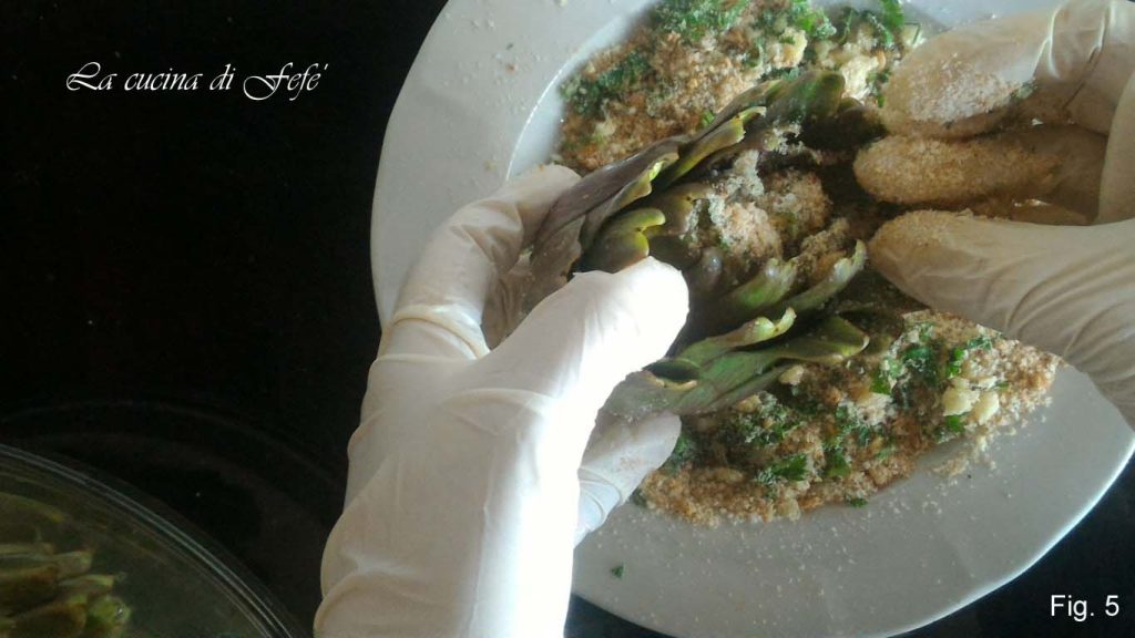 • Fill each artichoke with this breadcrumb mixture, massage the exterior with a drizzle of oil, and roll it also in the breadcrumb mixture (fig. 5).