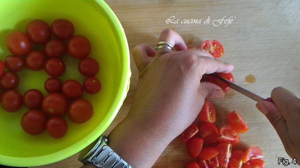 Meanwhile, wash the cherry tomatoes and cut them into quarters.