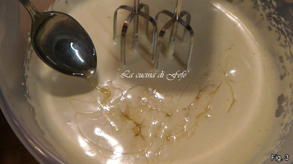 Add the honey to the whipped mixture and continue working for another 5′. The longer you work the eggs, the taller and softer the bundt cake will be (fig. 3).