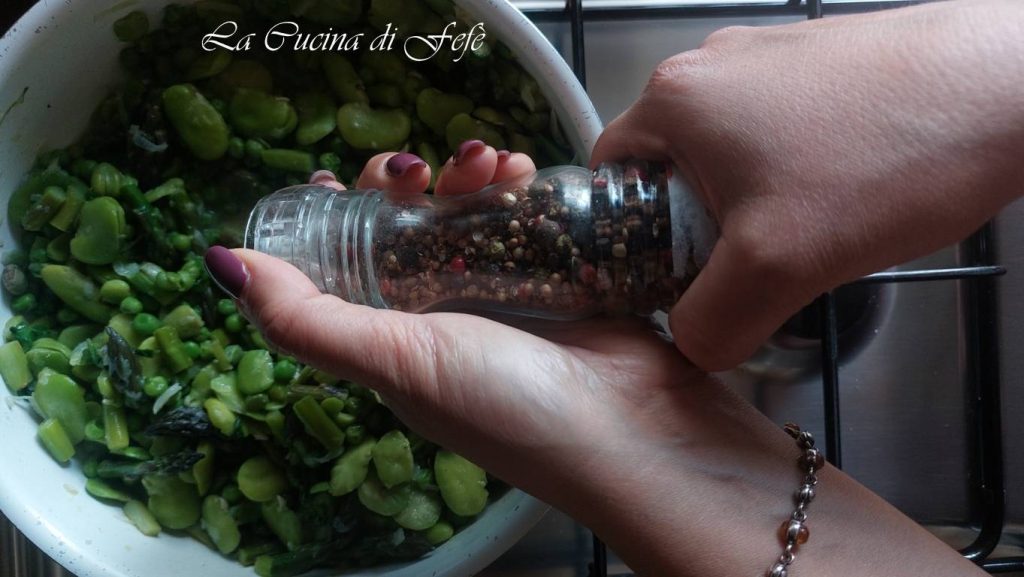 Then add the peas and the already shelled and skinned fava beans and let them simmer gently for about 10′ with a lid on, adding more hot broth only if needed.