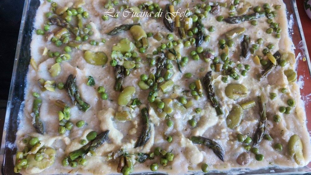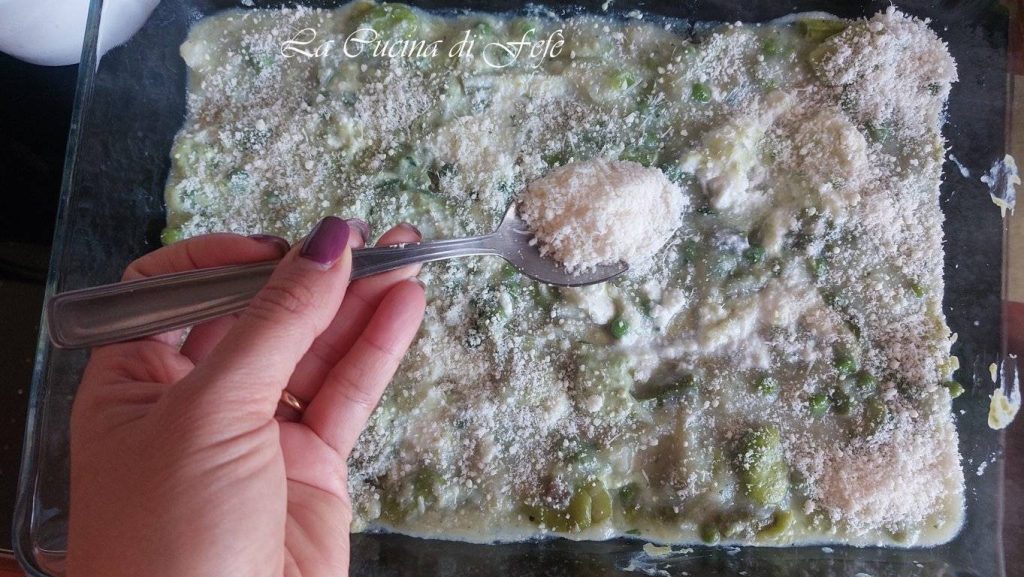 Create the first layer of lasagna, then spread a little ricotta cream, 1-2 ladles of fake béchamel, a few tablespoons of the asparagus, peas and fava mixture and sprinkle with grated Parmigiano and pecorino.