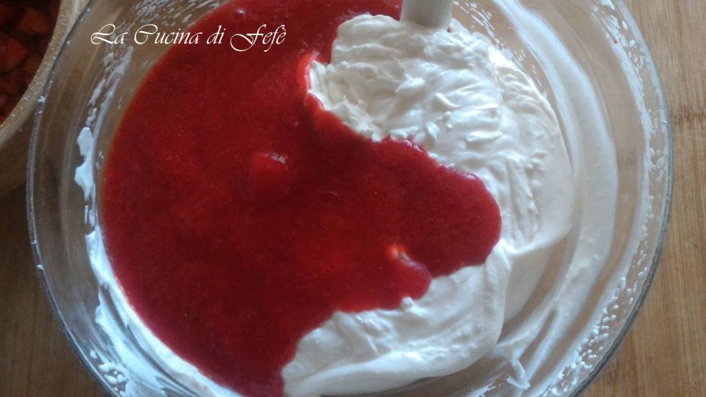 Add the strawberry puree as well and mix with a spatula with very gentle motions from bottom to top to avoid deflating the mixture.