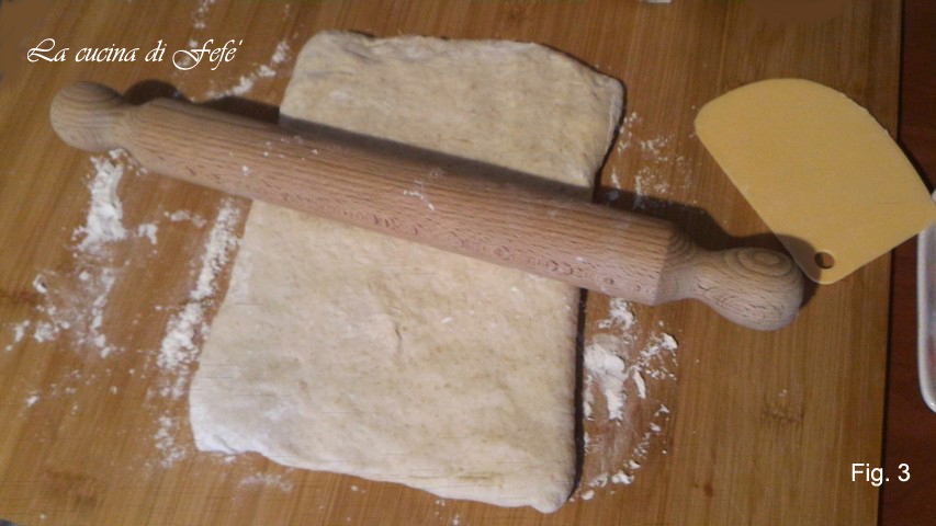 Transfer the dough to a floured work surface and roll it out first with your hands and then a little with the rolling pin to get a rectangle that is not too thin (fig. 3).