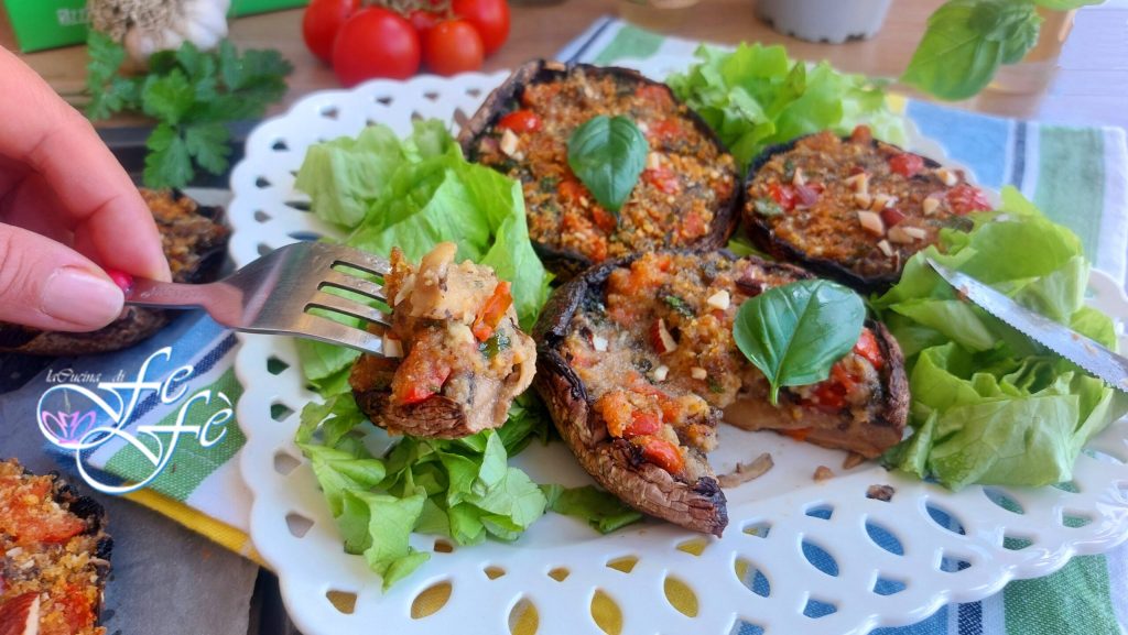 Currently, I still find three types of mushrooms at the local market under my house: the usual Champignon, Pleurotus, and Portobello mushrooms! My inspiration during my shopping trip came from the latter, perhaps because they lend themselves more than any other to being stuffed with whatever our imagination suggests! In my case, more or less with everything that urgently needs to be used from the fridge! Stuffed Portobello mushrooms, in fact, are perfect for hosting the most incredible and delicious fillings because they are quite large! Depending on the filling, they become a truly tasty and surprisingly scenic main dish and, if needed, a rustic and flavorful appetizer by adding or replacing certain ingredients. I chose a very rich breading based on bread crumbs, Grana Padano, cherry tomatoes, hand-fillet organic anchovy fillets, and last but not least, almond grains for a final touch of crunchiness! They’re prepared in a few steps, and following my tips, success on your tables is guaranteed.
