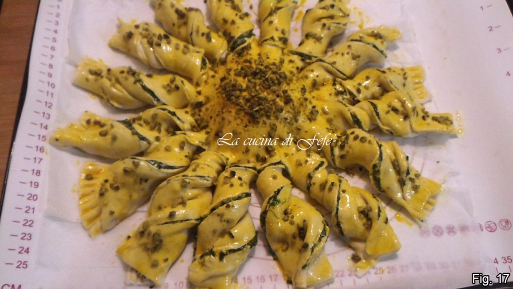 Sprinkle the entire surface with the pistachio crumble, concentrating the largest portion right in the center (fig. 17).