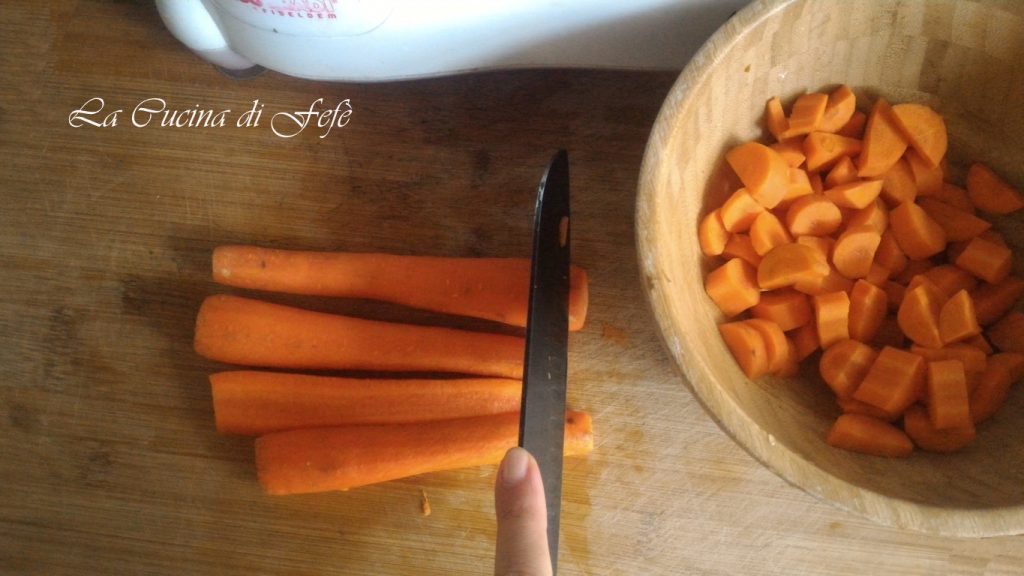 First, clean the carrots by washing them under running water, then trim and peel them with a peeler, and cut them into small pieces with a knife.