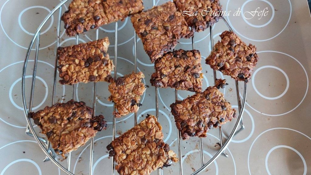 Before finding a satisfying balance between flavor and texture, I did several tests for these breakfast cookies that I swear are spectacular! My recipe contains no added sugars, only the natural ones from the fruit, specifically bananas, which I emphasize must be ripe, or the final result will suffer! The rest speaks for itself: lots of whole grain oats and a touch of peanut butter that adds a more delicious flavor and, if consumed in moderation, is also good for your health! With the amounts I give you, you’ll get about 8, though it depends on how large you cut them! The recipe is disarmingly easy; the only tricky part is the spreading on the baking sheet—the dough shouldn’t be too thick, or they won’t become very crunchy and will have more of the consistency of soft cereal bars. Still tasty, but if you’re looking for the crunch effect, I invite you to follow the recipe steps carefully. I leave you two versions: a simple one and one with the addition of chocolate chips that I highly recommend; we loved it! Snack on them at breakfast, in the afternoon as a snack, or as a simple and healthy treat during your busy days; you’ll fall in love with them!