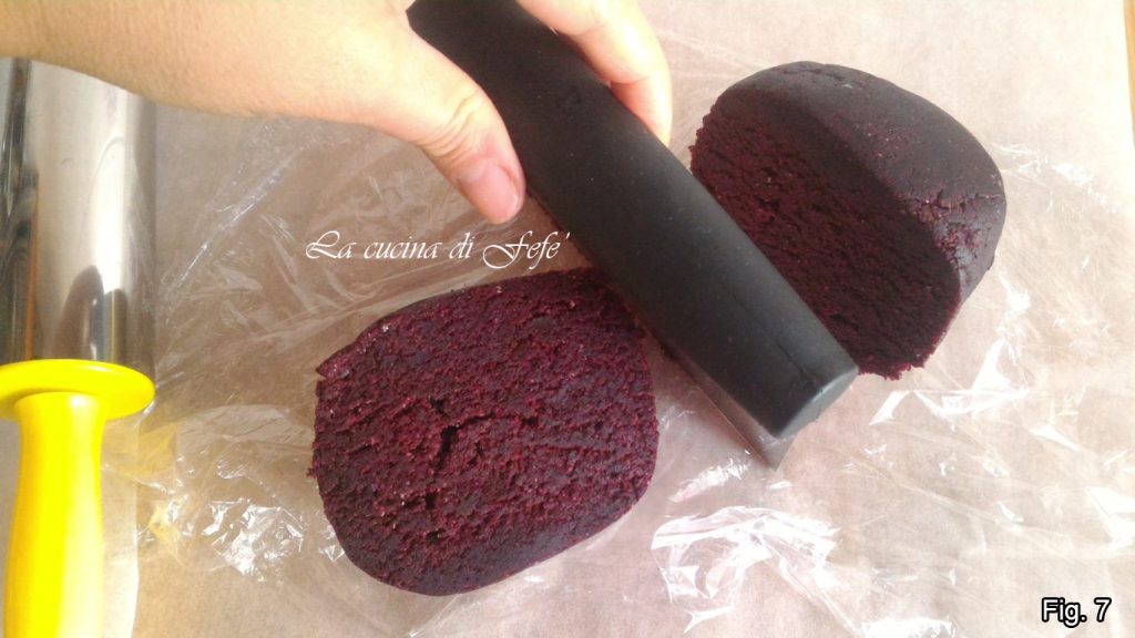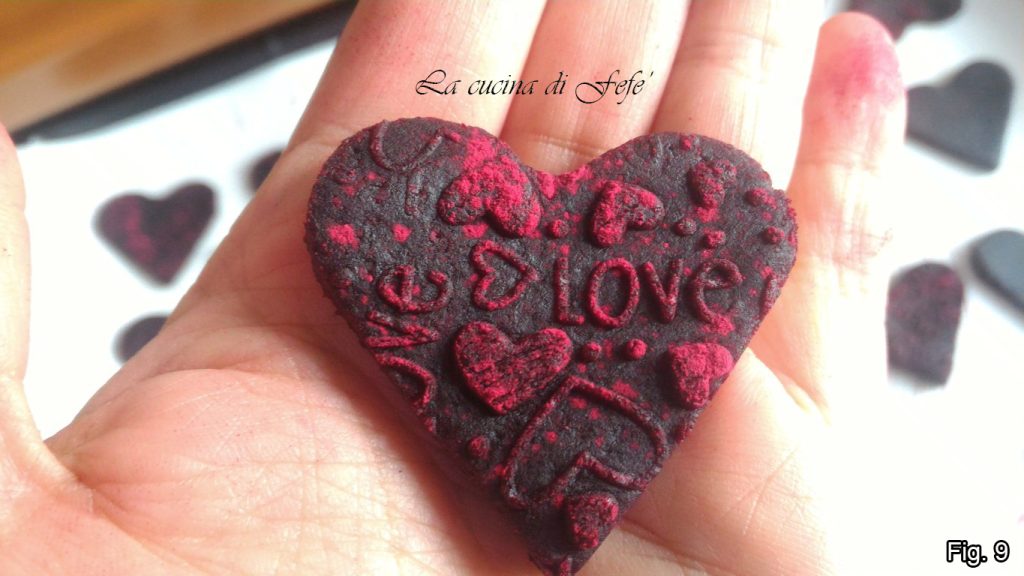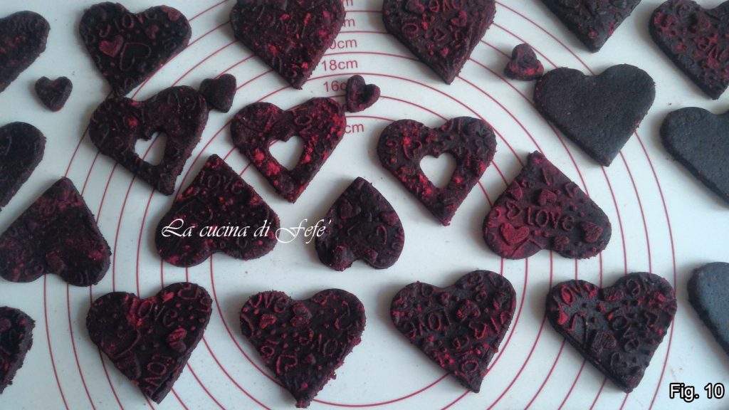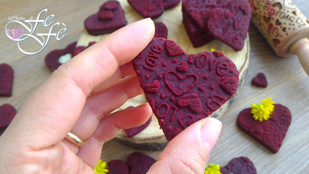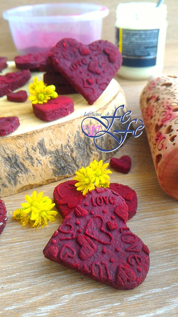 Roll out the other half between two sheets of parchment paper with the help of a rolling pin. I then dusted with beetroot flour and passed the surface with a decorative rolling pin, a completely optional step. Then cut out your cookies with a heart-shaped cutter.