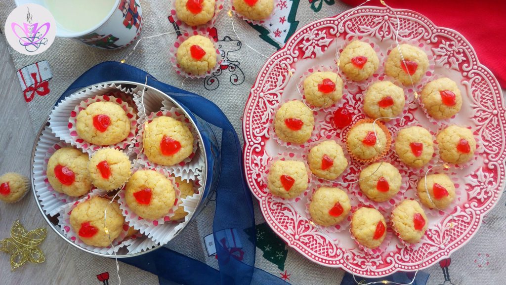 • Garnish each cookie with candied cherries cut into small pieces. Put in a preheated oven and bake at 356°F for 15′. Since timings vary from oven to oven, I recommend keeping them in the oven until they are slightly golden.
