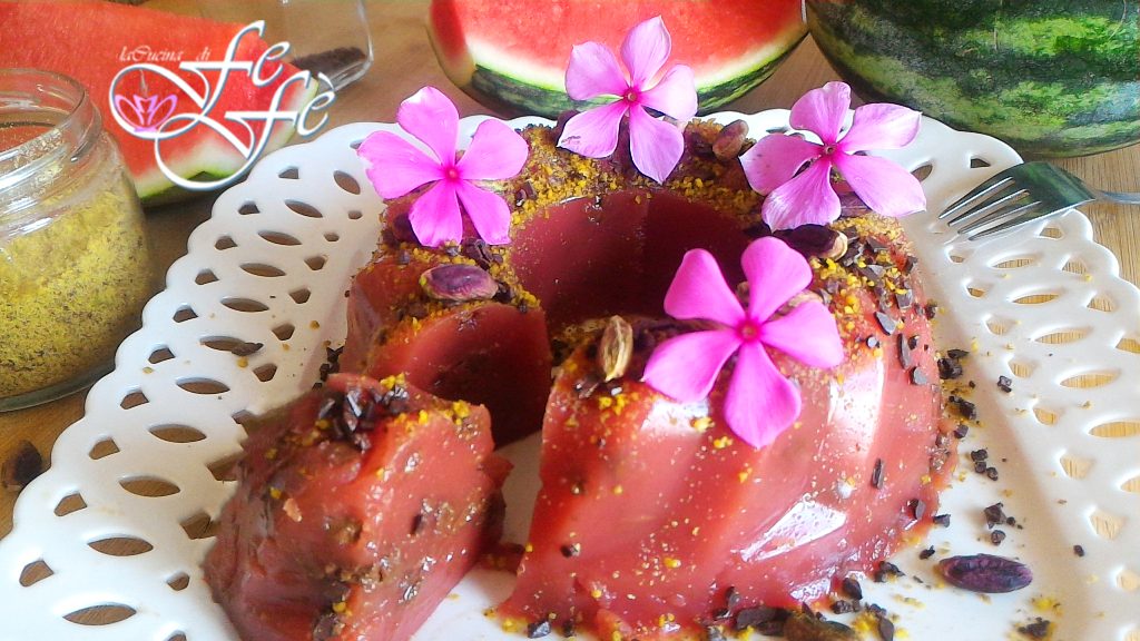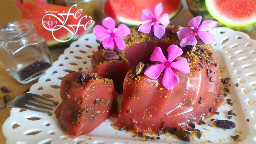 This summer has been marked by an unusual, excessive, and relentless heat, at least as far as southern Italy is concerned! Enjoying something fresh without overdoing the calories is essential! And then, what’s better than a nice watermelon gel? In Catania, the quintessential gel is almond-based, but among the variations, this is surely the most refreshing and genuine! It is a light dessert by the spoon, with delicious chocolate chips simulating the seeds of this thirst-quenching fruit. Very popular especially in Palermo, being the traditional sweet of the feast of Santa Rosalia, the city’s patron saint, it is also present in other parts of Sicily. Of course, with its endless variations both in preparation and in the dialectal ways of calling it. The most known is gelo di muluna or mellone, the dialectal term indicating watermelon. Simple to prepare, it is a perfect dessert even for those gluten intolerant, as it is made with only cornstarch. Two simple tips for the success of the dessert! First, the choice of watermelon should be red and juicy, so that, depending on the sweetness level, you can almost reduce the sugar doses. The other is the waiting time after preparation, which should be at least three hours in the fridge before unmolding it, otherwise it will affect the final result. Now prepare it and enjoy it!