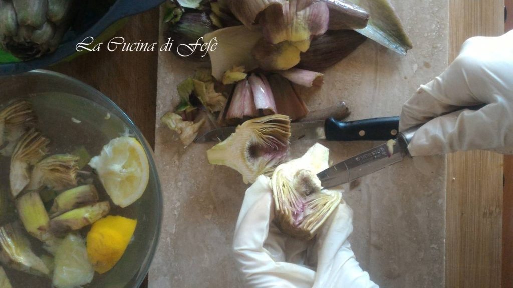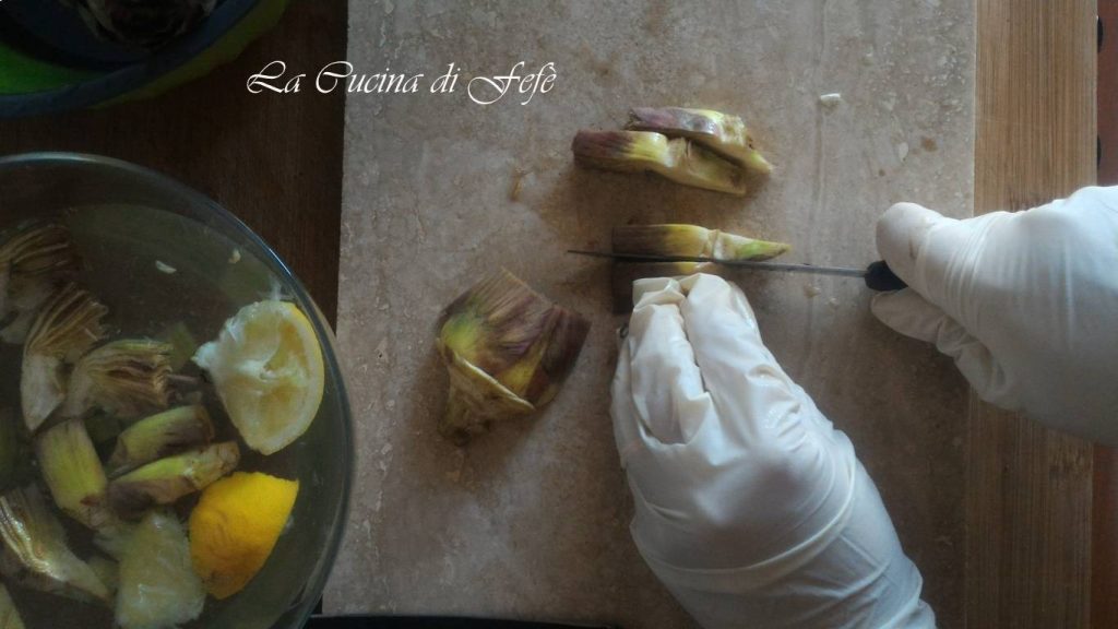 Once the béchamel is ready, take care of cleaning the artichokes. In a large bowl, prepare some acidulated water with lemon juice, which will prevent them from oxidizing when exposed to air. Then, with a knife, separate the flowers from the stems, peeling the latter and cutting them into chunks. Remove the outer leaves until you reach the hearts, then cut about 1.2 inches from the tips to remove them. Divide the hearts in half and remove the internal “beard” (or choke).
