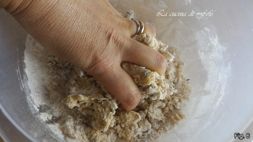 When the dough becomes more consistent, start kneading it with your hands, initially in the bowl (fig. 6).