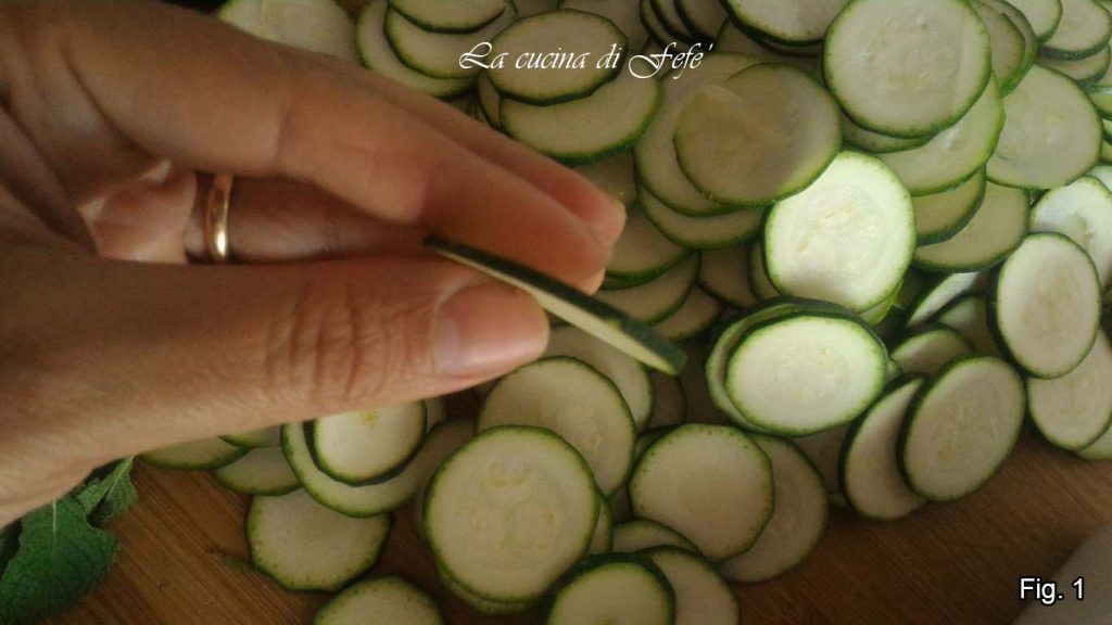 Wash and trim the zucchini, then slice them into rounds not too thick. To speed up this step, you can use a food processor or a vegetable slicer (fig. 1).