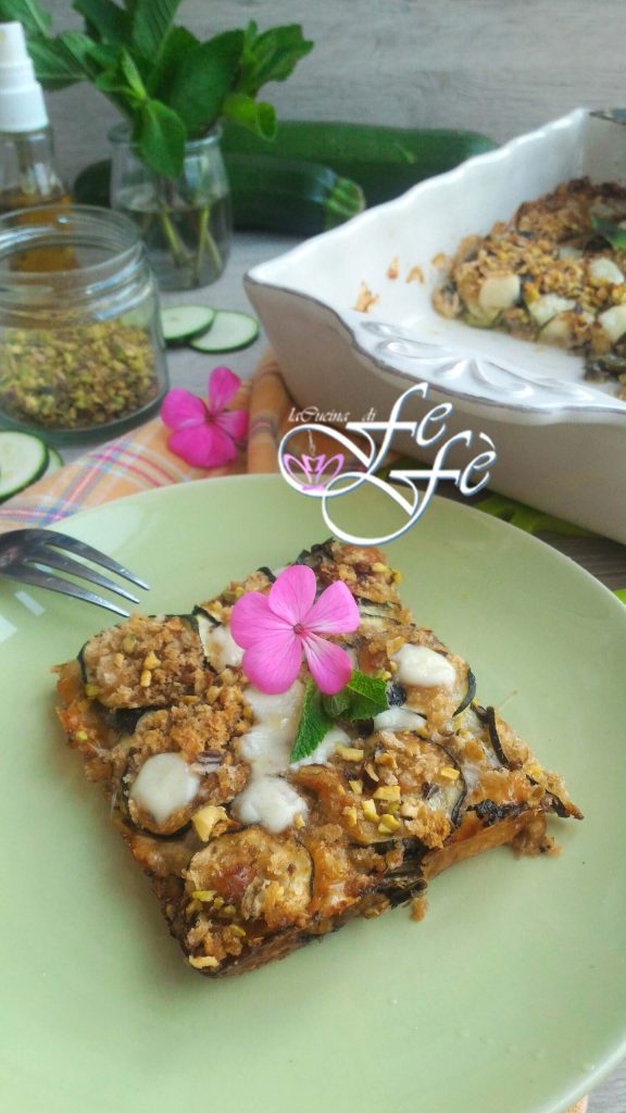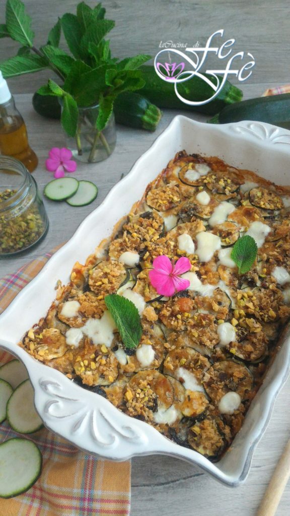 If you’ve never tried the zucchini version of parmigiana, it’s time to experiment! In fact, this is a second version, equally delicious compared to its counterpart, the more summery zucchini parmigiana with bell pepper cream and Greek feta cheese that I made last summer, which I highly recommend you try! Moreover, it is really easy and quick if you consider that all the ingredients will be assembled raw directly in the pan. So, no frying, but a light and healthy dish. Also, compared to the first version, I opted for a more delicate combination, adding a spun cheese like provola and giving a touch of Sicilian flair and crunchiness by sprinkling some Bronte pistachio granules between each layer and in the final breading! Once cold, it will be perfect cut into squares and served as a starter at an informal buffet or as a vegetarian main course. Try both versions and let me know which one you liked the most!