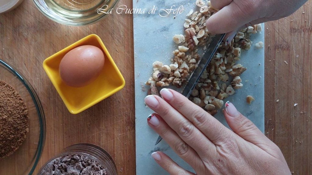 Now focus on the mix of walnuts and hazelnuts. These should also be chopped with a knife. Choose to chop them more or less finely according to your taste, and set aside.