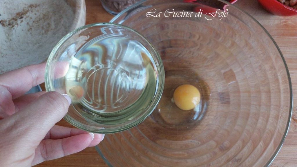 In a large mixing bowl, first add the egg and then the peanut oil.