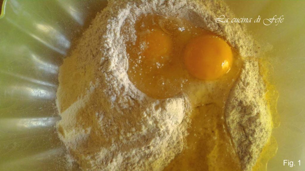 Pour the two flours into a large bowl, make a well, and crack the eggs in the center (fig. 1).