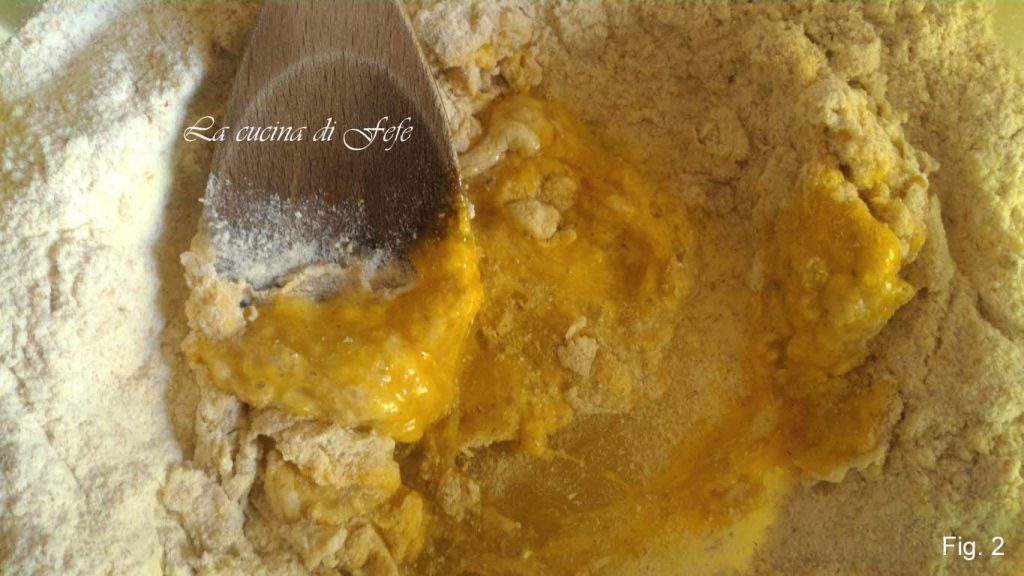 Add a pinch of salt and start mixing and combining first with a wooden spoon (fig. 2).