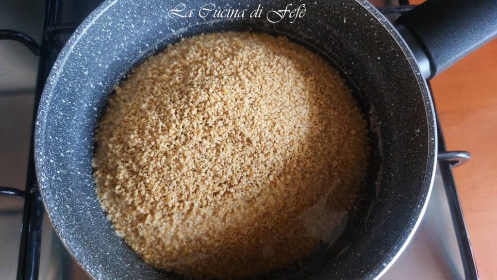 • Heat an amount of water equal to the cous cous in a pan, slightly salted, without boiling. Turn off, pour the semolina in a rain, close with a lid, and let it rest for 5 minutes.