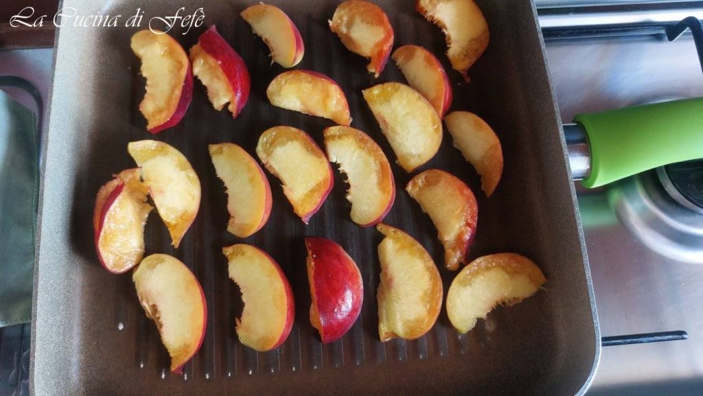 • Add the cheese cubes and grilled peaches with their seasoning.