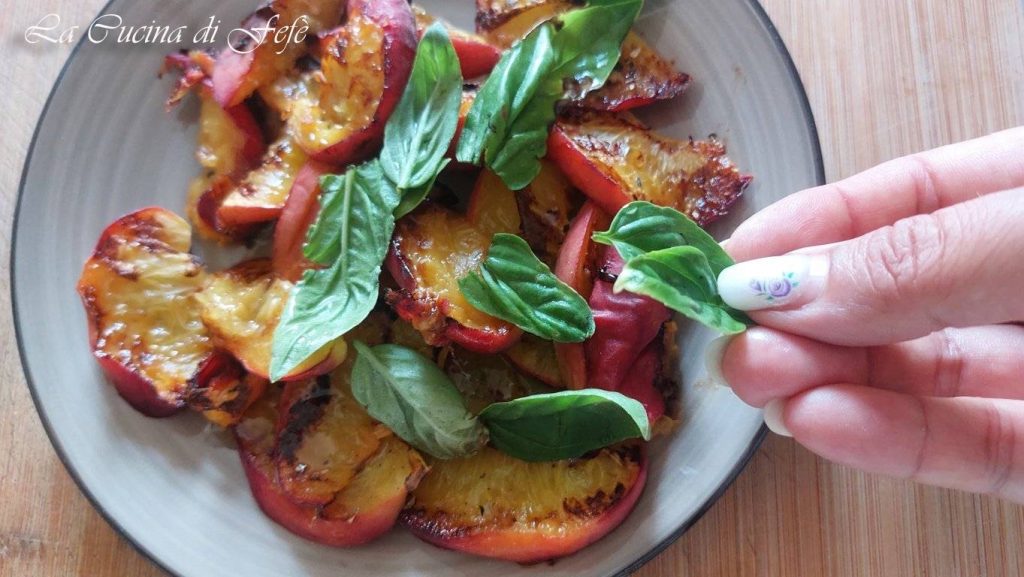• Transfer the grilled peaches to a plate and season them with a pinch of salt, a dash of pepper, a generous drizzle of oil, and a few leaves of basil.