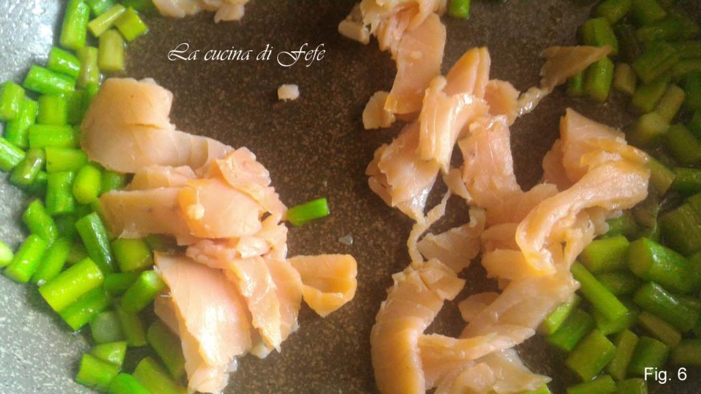 Cut the salmon into strips and add it to the asparagus (fig. 6).