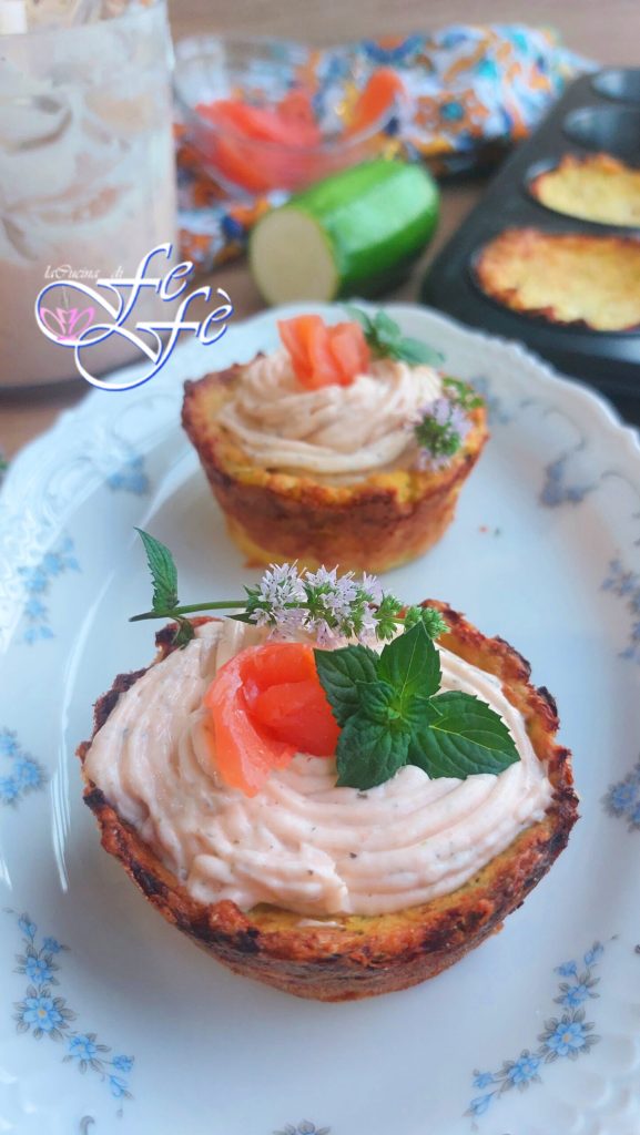 This recipe was born from the need to consume some expiring eggs and not-so-fresh zucchinis, but also from the desire to prepare something tasty and light! If, like me, you are looking for a dish that meets at least one of these two needs, then you absolutely must try these delicious and eye-catching zucchini baskets! They are quite easy to make, you’ll just need the usual muffin molds and you’re set! They will be perfect as an informal outdoor appetizer or as finger food served in a buffet during the aperitif! They can be enjoyed both warm and cold, so they are perfect from spring through all summer! Additionally, they are also gluten-free because they are made with corn flour, the fine type mind you, not the fioretto type to be clear! So, in short, you will satisfy even those who are gluten intolerant with just a few simple moves! Which isn’t bad, don’t you think? These baskets will host a soft and velvety salmon and aromatic herbs mousse inside, giving the whole dish that touch of freshness and deliciousness that will surprise your guests! The quantities are enough for about five baskets, so for a buffet, I recommend doubling or even tripling the doses depending on your needs! You can also vary the filling by replacing the salmon with mortadella and chopped pistachio. Delightful, bite after bite!